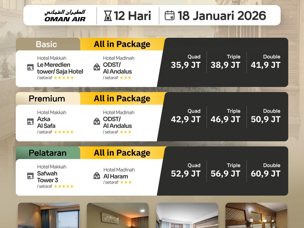 Apabila jamaah dalam satu rombongan tidak sesuai dengan tipe kamar yang dipilih atau tidak cocok dengan formasi tipe kamar yang tersedia, maka pihak travel berhak melakukan penyesuaian tipe kamar bagi jamaah tersebut.